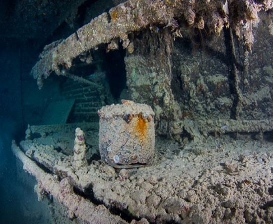 The middle section of the ship resembles a junkyard, as iron girders are bent and torn, and the sides lie collapsed on the seabed. This area of the wreck is teeming with crocodile fish, scorpion fish and parrot fish. Some groupers have also made their home here.